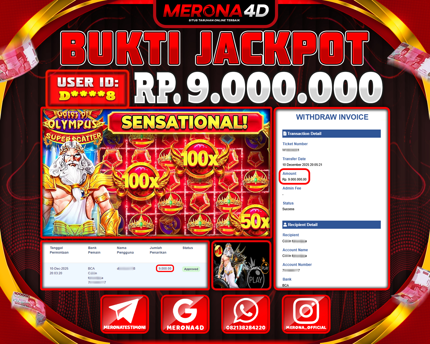Selamat Kepada Member MERONA4D D****8 Telah Jackpot Di GATES OF OLYMPUS SUPER SCATTER