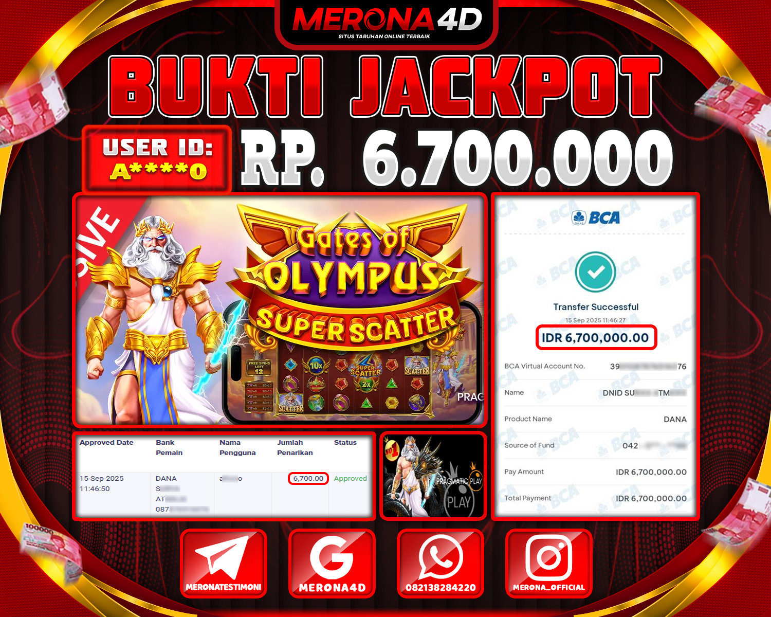 Selamat Kepada Member MERONA4D A****0 Telah Jackpot Di GATES OF OLYMPUS SUPER SCATTER