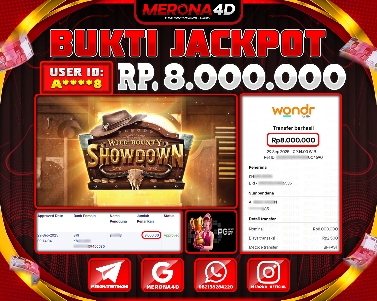 Selamat Kepada Member MERONA4D A****8 Telah Jackpot Di WILD BOUNTY SHOWDOW