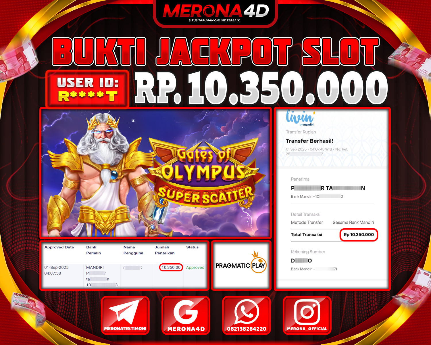 Selamat Kepada Member MERONA4D I*****71 Telah Jackpot Di GATES OF OLYMPUS 1000