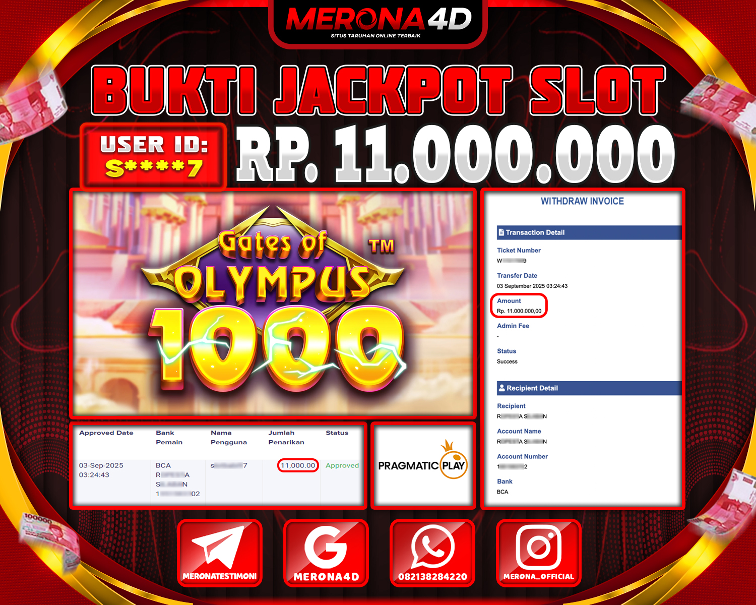 Selamat Kepada Member MERONA4D S****7 Telah Jackpot Di GATES OF OLYMPUS 1000