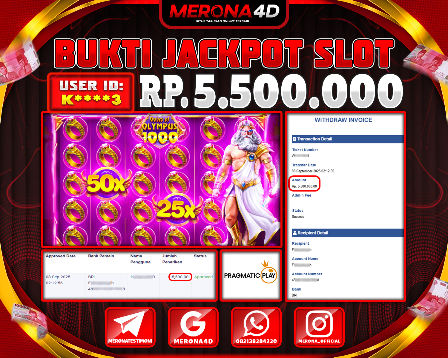 Selamat Kepada Member MERONA4D K****3 Telah Jackpot Di GATES OF OLYMPUS 1000
