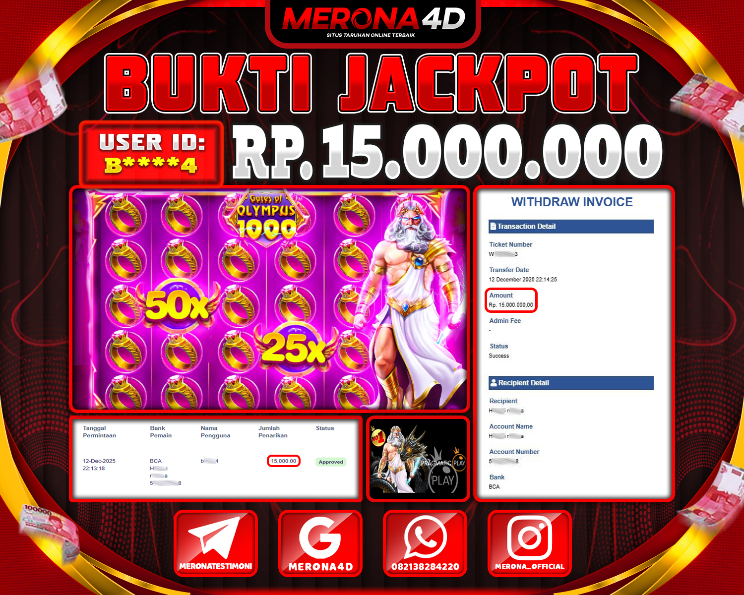Selamat Kepada Member MERONA4D B****4 Telah Jackpot Di GATES OF OLYMPUS 1000