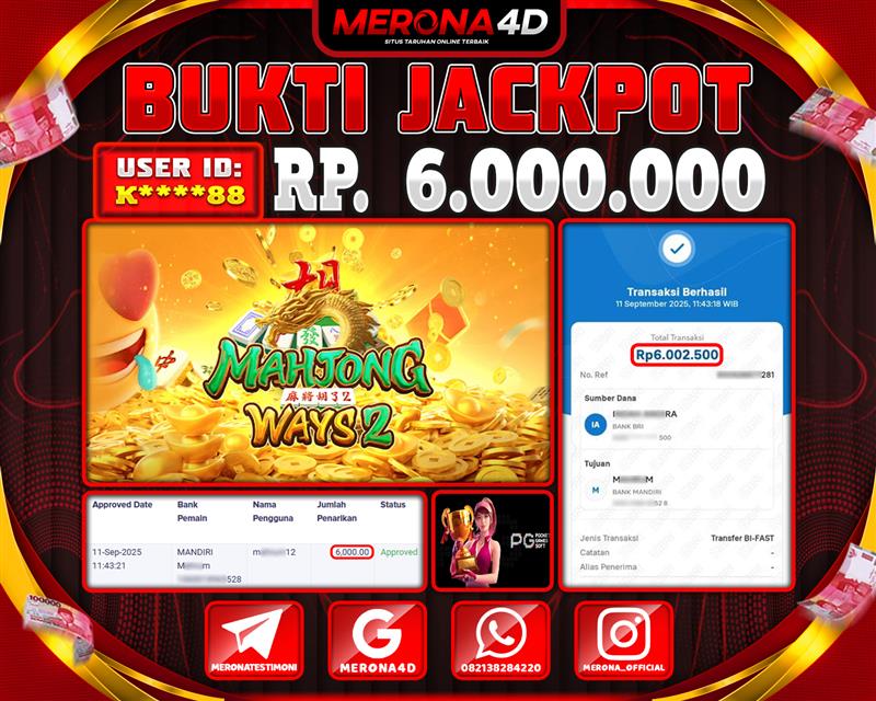 Selamat Kepada Member MERONA4D B****7 Telah Jackpot Di MAHJONG WAYS 2