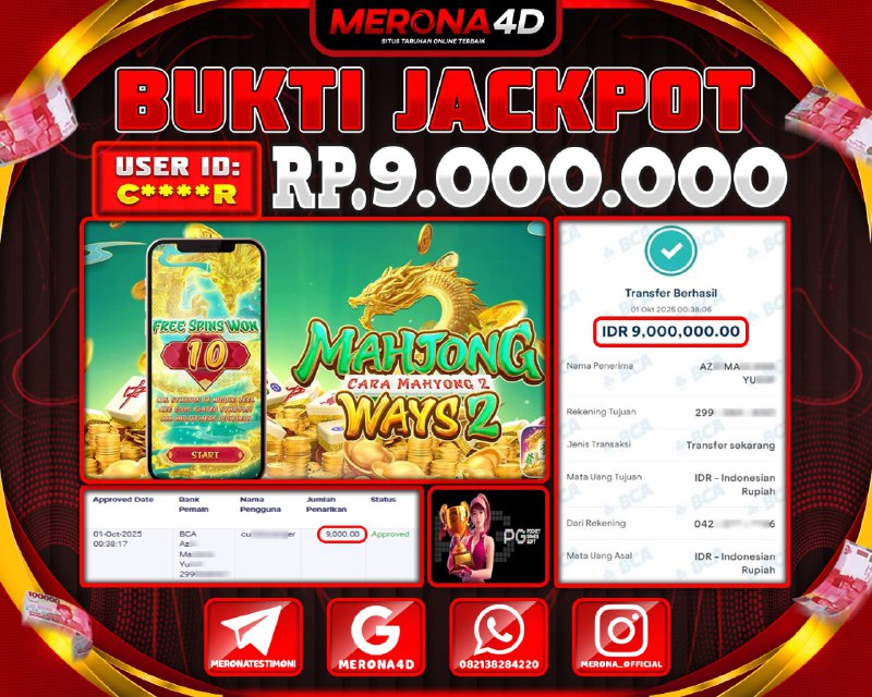 Selamat Kepada Member MERONA4D Cβ­‘οΏ½***οΏ½β­‘R Telah Jackpot Di MAHJONG WAYS 2