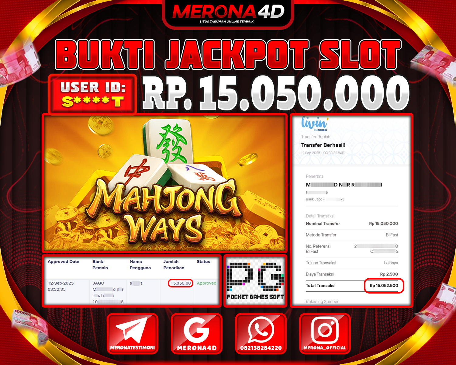 Selamat Kepada Member MERONA4D S****7 Telah Jackpot Di MAHJONG WAYS 2