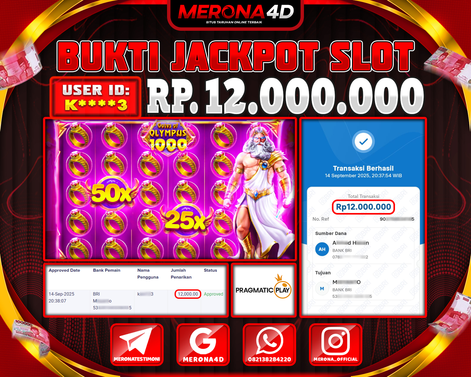 Selamat Kepada Member MERONA4D K****3 Telah Jackpot Di GATES OF OLYMPUS 1000