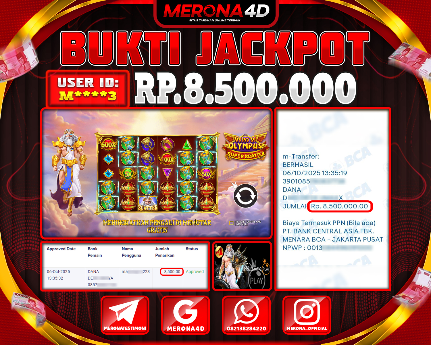 Selamat Kepada Member MERONA4D M****3 Telah Jackpot Di GATES OF OLYMPUS SUPER SCATTER