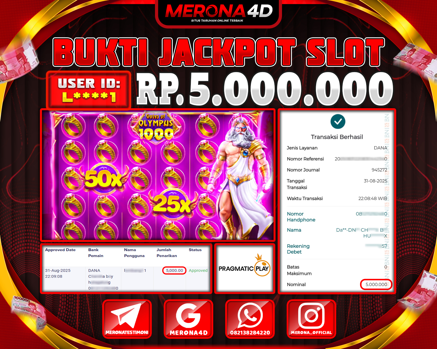Selamat Kepada Member MERONA4D L****1 Telah Jackpot Di GATES OF OLYMPUS 1000