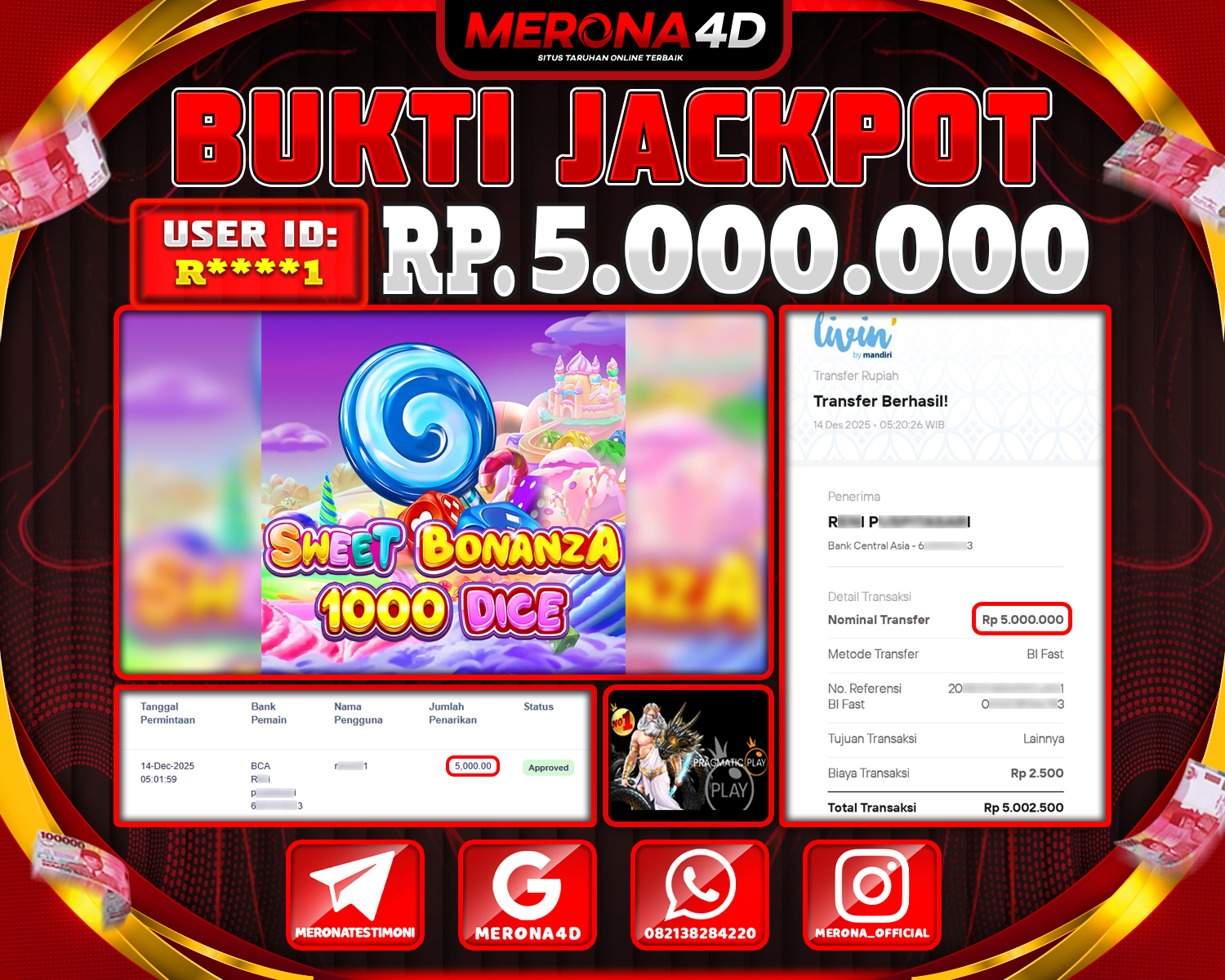 Selamat Kepada Member MERONA4D R****1 Telah Jackpot Di SWEET BONANZA 1000 DICE