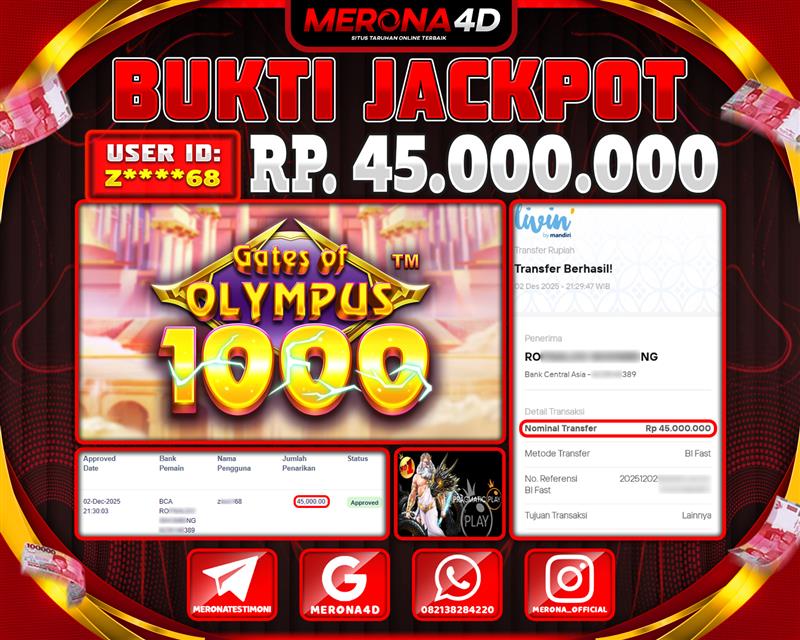 Selamat Kepada Member MERONA4D Z*****68 Telah Jackpot Di GATES OF OLYMPUS 1000