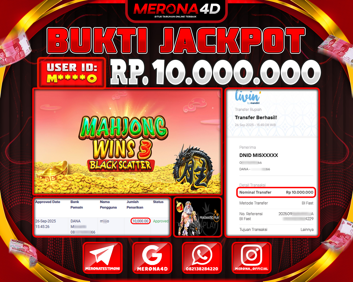 Selamat Kepada Member MERONA4D M****O Telah Jackpot Di MAHJONG WINS 3 – BLACK SCATTER