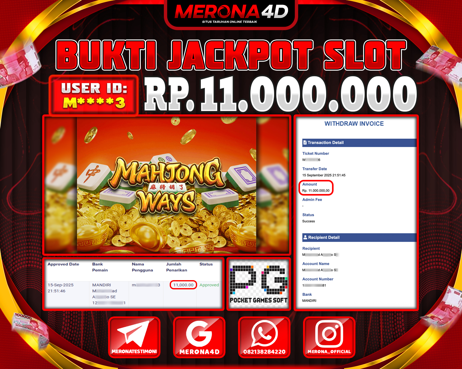 Selamat Kepada Member MERONA4D M****3 Telah Jackpot Di MAHJONG WAYS