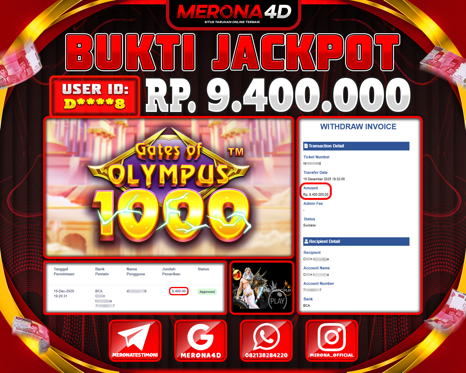 Selamat Kepada Member MERONA4D D****8 Telah Jackpot Di GATES OF OLYMPUS 1000