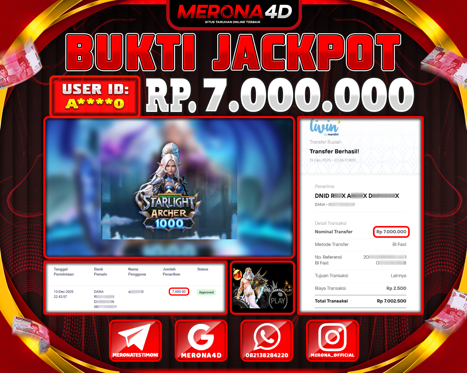 Selamat Kepada Member MERONA4D A****0 Telah Jackpot Di STARLIGHT ARCHER 1000