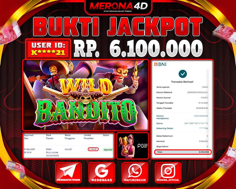 Selamat Kepada Member MERONA4D K*****21 Telah Jackpot Di WILD BANDITO