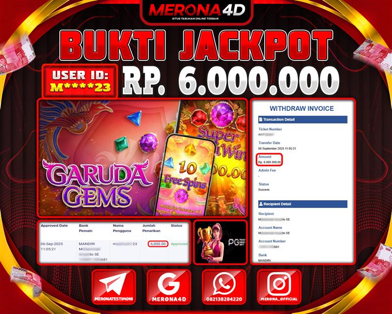 Selamat Kepada Member MERONA4D M*****23 Telah Jackpot Di GARUDA GEMS