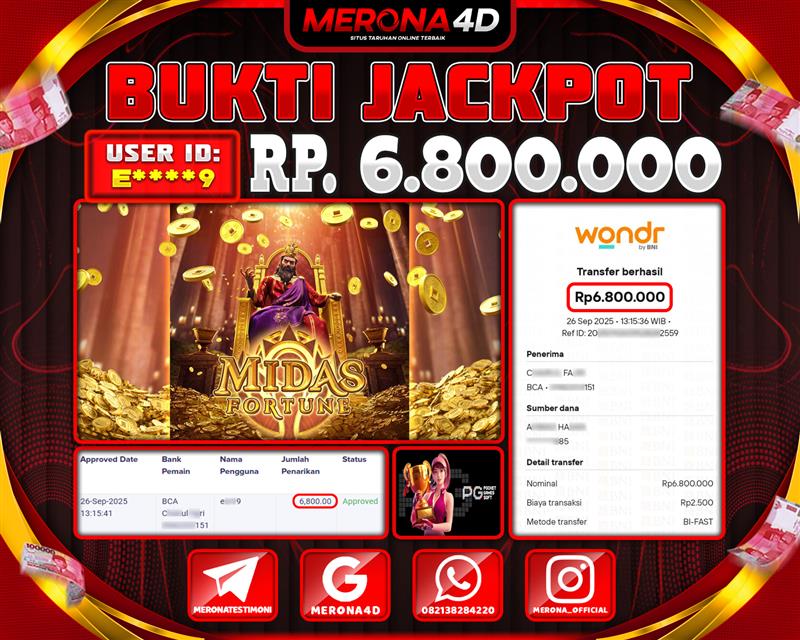 Selamat Kepada Member MERONA4D E****9 Telah Jackpot Di MIDAS FORTUNE