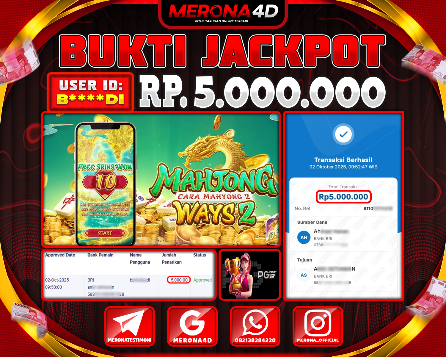 Selamat Kepada Member MERONA4D B****7 Telah Jackpot Di MAHJONG WAYS 2