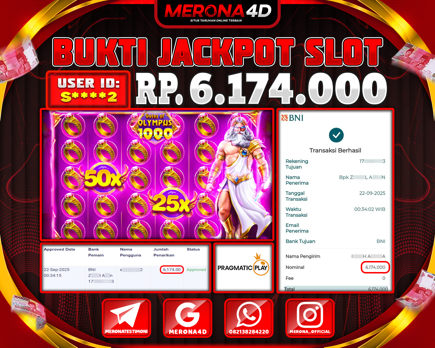 Selamat Kepada Member MERONA4D S****2 Telah Jackpot Di GATES OF OLYMPUS 1000