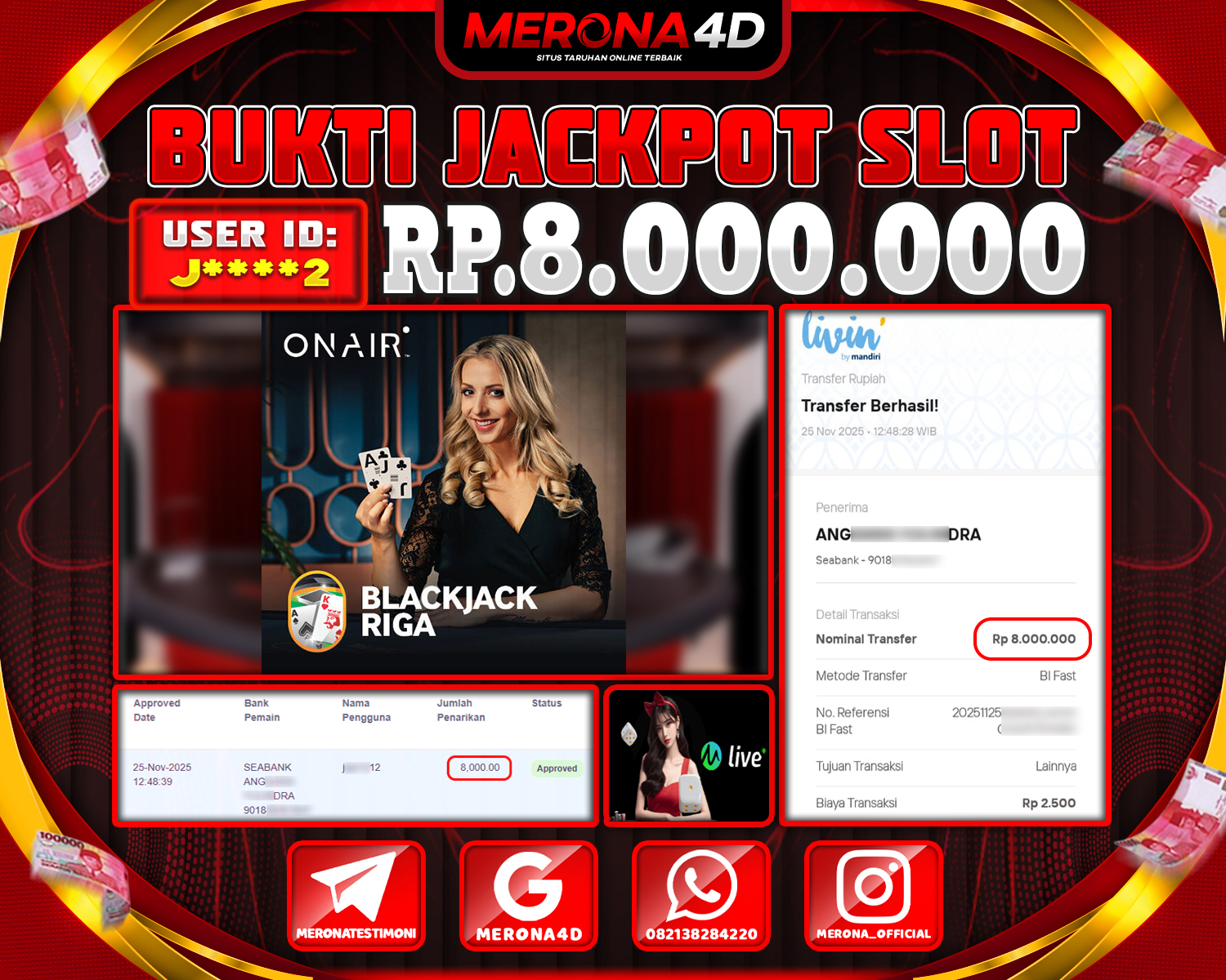 Selamat Kepada Member MERONA4D J****2 Telah Jackpot Di BLACKJACKRIGA