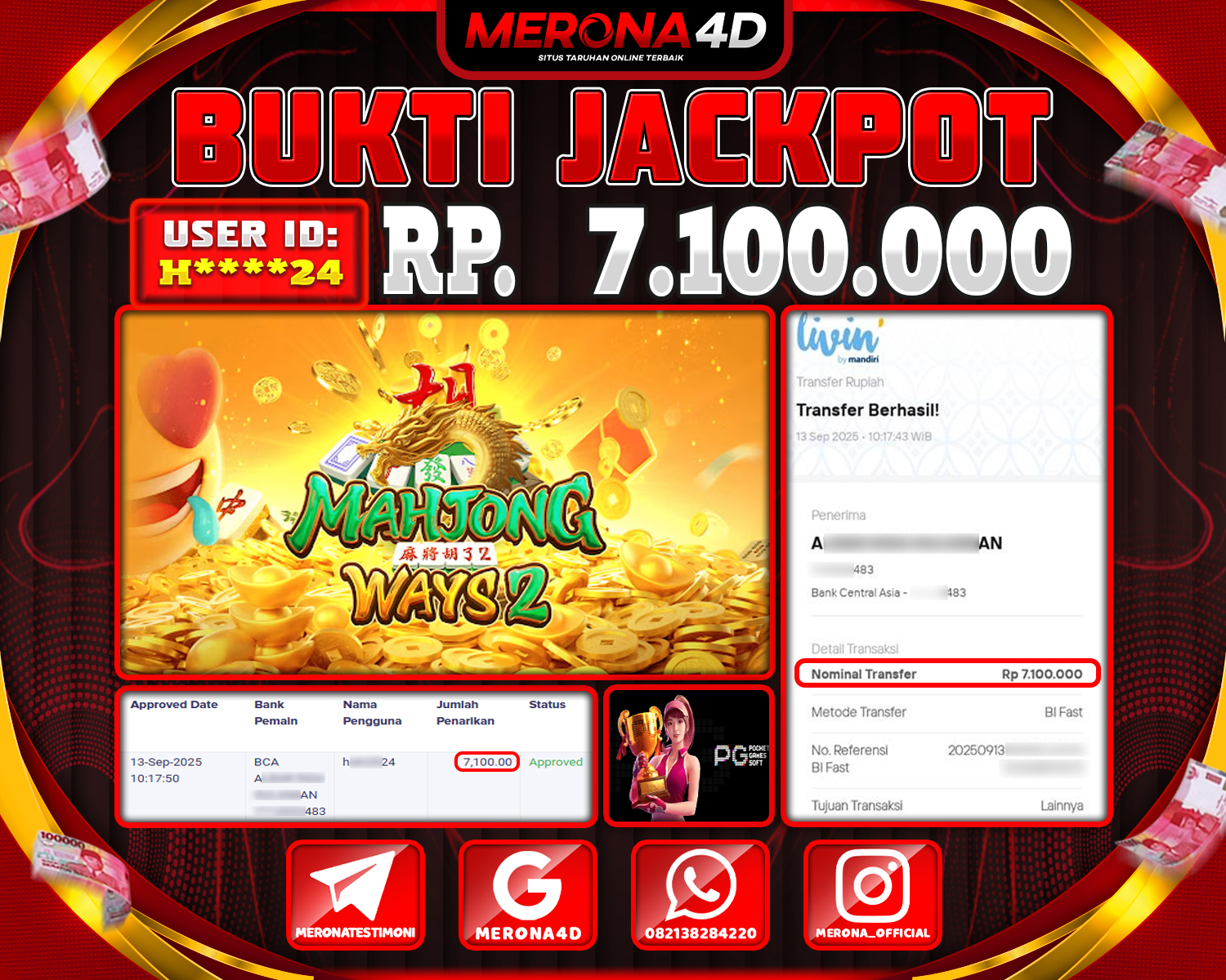 Selamat Kepada Member MERONA4D H*****24 Telah Jackpot Di MAHJONG WAYS 2