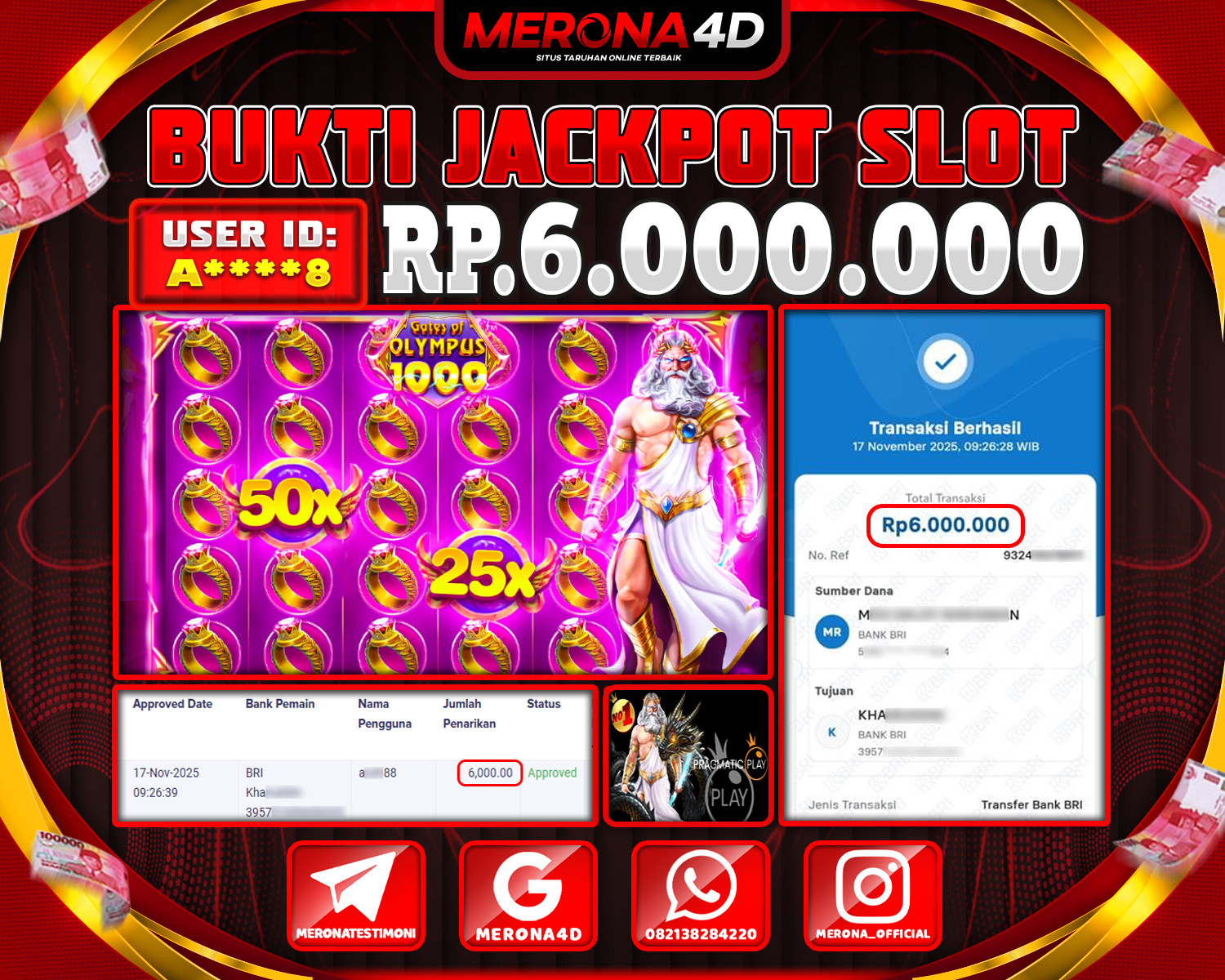 Selamat Kepada Member MERONA4D L****1 Telah Jackpot Di GATES OF OLYMPUS 1000
