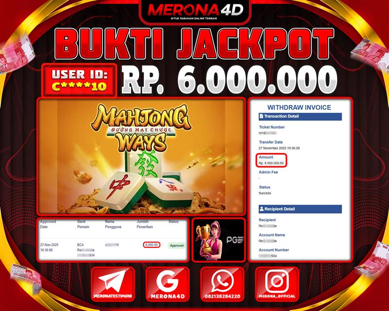 Selamat Kepada Member MERONA4D C*****10 Telah Jackpot Di MAHJONG WAYS 2